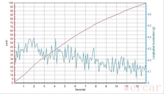 如图中的加速曲线所示,由于小惯量涡轮的加入,涡轮建压较早(1500rpm开始介入),所以初段动力很快就能达到加速G值的顶峰(接近0.4G)。不过以0.4G左右的G值来说,营造出来的加速感较弱,相比于1.8L混动车型在起步阶段电机带来的爆发性输出,这个1.2T的初段加速感可谓平淡。最终我们做出来的百公里加速成绩为12.96秒,这个成绩与目前排量1.6L左右的自吸车型(如全新轩逸:12.1s)成绩是接近的,整个动力只能说刚刚够用。