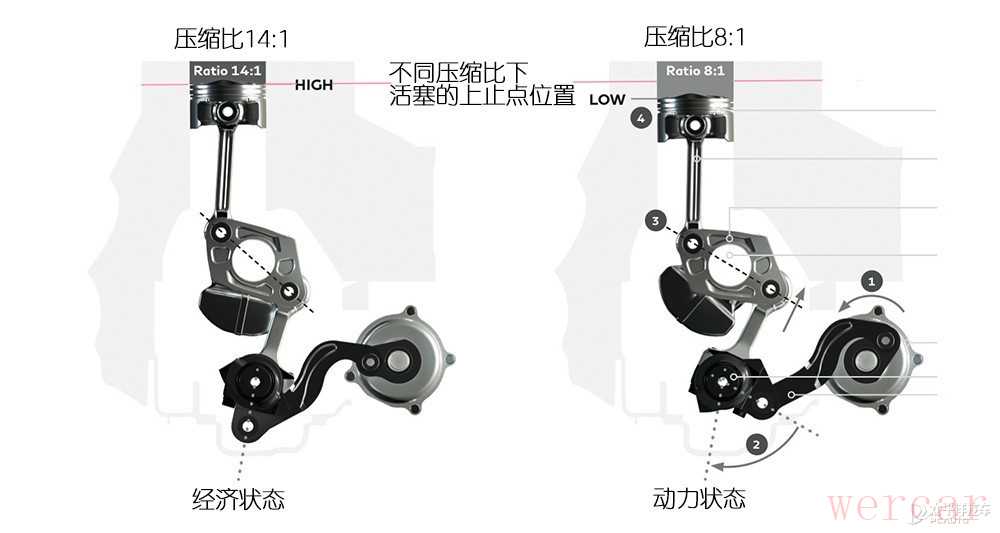 这台发动机是如何实现可变压缩比?首先常规发动机的压缩比其实就是活塞位于下止点时气缸的总容积除以活塞位于上止点时燃烧室的容积,通俗点可以理解为混合气的压缩程度。传统的发动机由于机械结构几何运动时固定的,所以机械压缩比的数值都是固定的。也正是这个原因,所以很多发动机在所压缩比选择时,只能根据发动机的定位来选择一个固定的数值。一般而言偏高的压缩比可以提升燃油效率,降低油耗,偏低的压缩比可以提升动力表现。