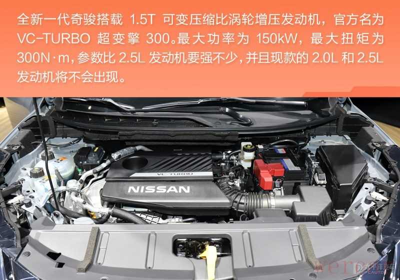 全新一代奇骏是继天籁以后,第二款采用可变压缩比发动机车型,只不过奇骏的发动机排量变为1.5L,是日产首次推出1.5L排量的可变压缩比涡轮增压发动机(发动机代号为KR15),据消息称目前这个1.5T可变压缩比发动机目前是进口的,但国内郑州的生产线正在建设,日后会加入国产。这套1.5T动力系统是率先在中国投放的,北美市场未来也会投放使用。