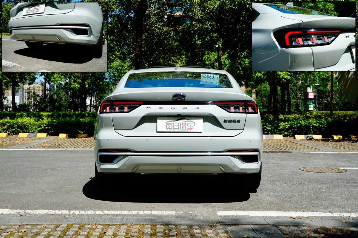 尾部基本没变化,断面比较垂直,曲面变化丰富。顶部用鸭尾造型降低风阻,野马风格三柱式尾灯增加熏黑装饰,灯带辨识度不错,但中央并没有贯穿。在保险杠中央增加了横贯的装饰条和两侧矩形排气管造型,底部还有上翘的扩散造型,提升运动感。