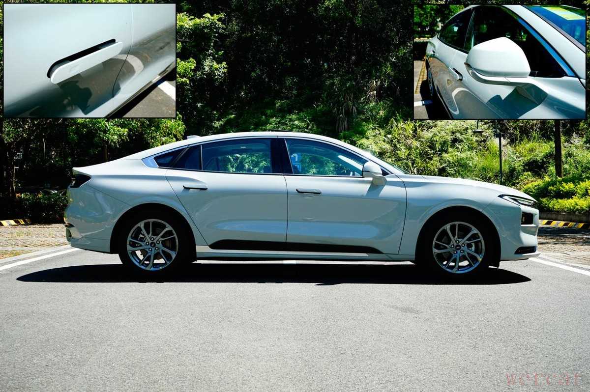 侧面造型没有变化,前后悬基本等长,车顶有溜背造型,车尾有上翘,只是车头较为垂直,削弱了运动感。车身曲面变化丰富,采用分段式腰线,立体的底裙,装饰色有镀铬和黑色,也比较丰富。保留了隐藏弹出式门把手,仪式感更出色。