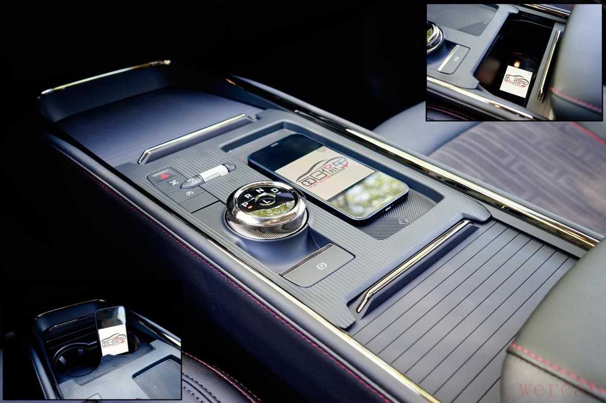 挡杆台功能区划分清晰,电子换挡旋钮靠左居中,周围布置少量按键。前方滑盖内置双水杯架,右侧是带无线充电模块的手机储物格,后方有带USB和Type-C接口的隐藏储物格。