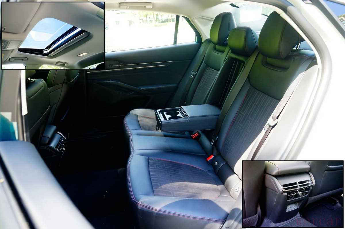 后排座椅材质和缝线均与前排一致,坐垫长度略微短了些,腿部承托力有所缺乏,靠背有一定的侧向支撑。空间方面,侃弟身高175cm,腿部空间三拳,头部正好为一拳,横向可轻松乘坐三人。配置上,提供三个独立头枕、带两个水杯架的翻折扶手、地台式出风口、Type-C和USB接口,但取消了分段式天窗。
