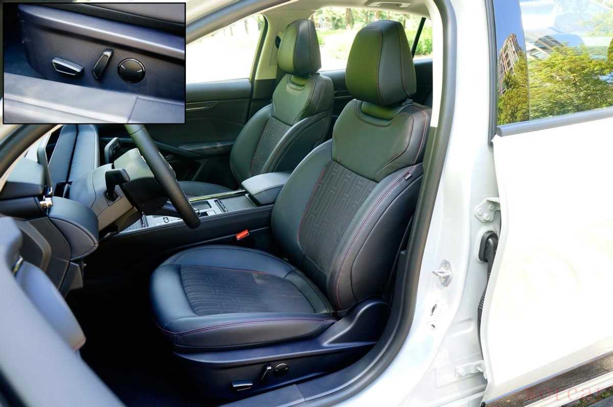 座椅采用皮+织物混搭材质,取消前排通风和加热功能,夏日背部很容易汗湿。填充物还算饱满厚实,侧向支撑也没有问题。主驾驶座椅支持前后、靠背、高低(4向)和腰部(2向)电动调节,副驾驶少了腰部(2向)电动调节,驾驶位记忆只有顶配车型提供。
