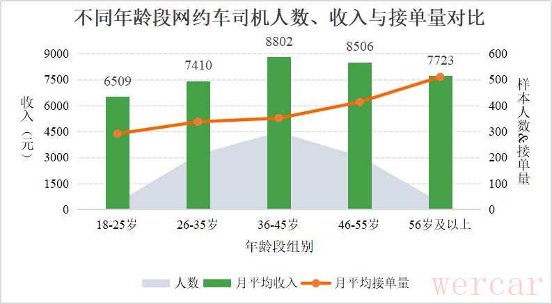 从年龄维度,36-45岁、46-55岁司机群体月均收入最高,分别为8802元、8506元;学历维度,高中学历群体月均收入最高,为8693元。报告认为,这种年龄和学历上的收入特征,验证了网约车司机是以服务为导向、多劳多得、高度包容的就业形态,为社会各类群体,尤其是在传统就业市场可能处于劣势的人群,提供了凭劳动吃饭、用服务说话的公平舞台。