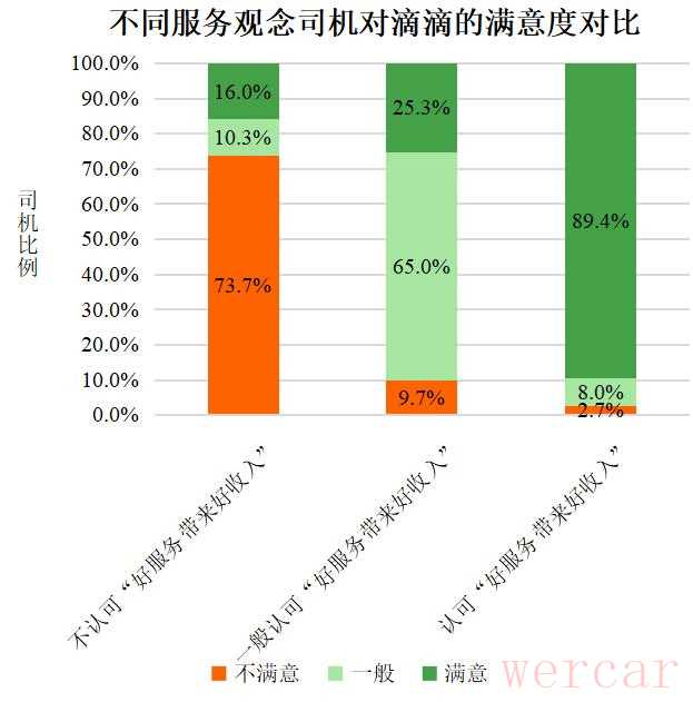 调研显示,司机的服务观念和其对平台的满意度也有关联。认可“好服务带来好收入”的司机群体,对平台的满意度显著高于其他群体,有趣的是,他们恰好也是获得较高收入的司机。