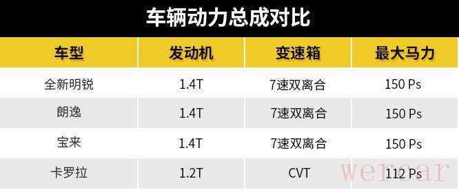 动力方面,四款车型均有多个动力总成的版本推出,我们均选择其最高动力版本车型进行对比。可以看出,全新明锐的动力参数明显领先于卡罗拉,并与同为大众集团旗下车型的朗逸和宝来参数一致。不过,虽然三款车发动机的最大功率相同,但其发动机与变速箱的调较风格还存在着一定的不同,具体表现还需试驾后才有定论。