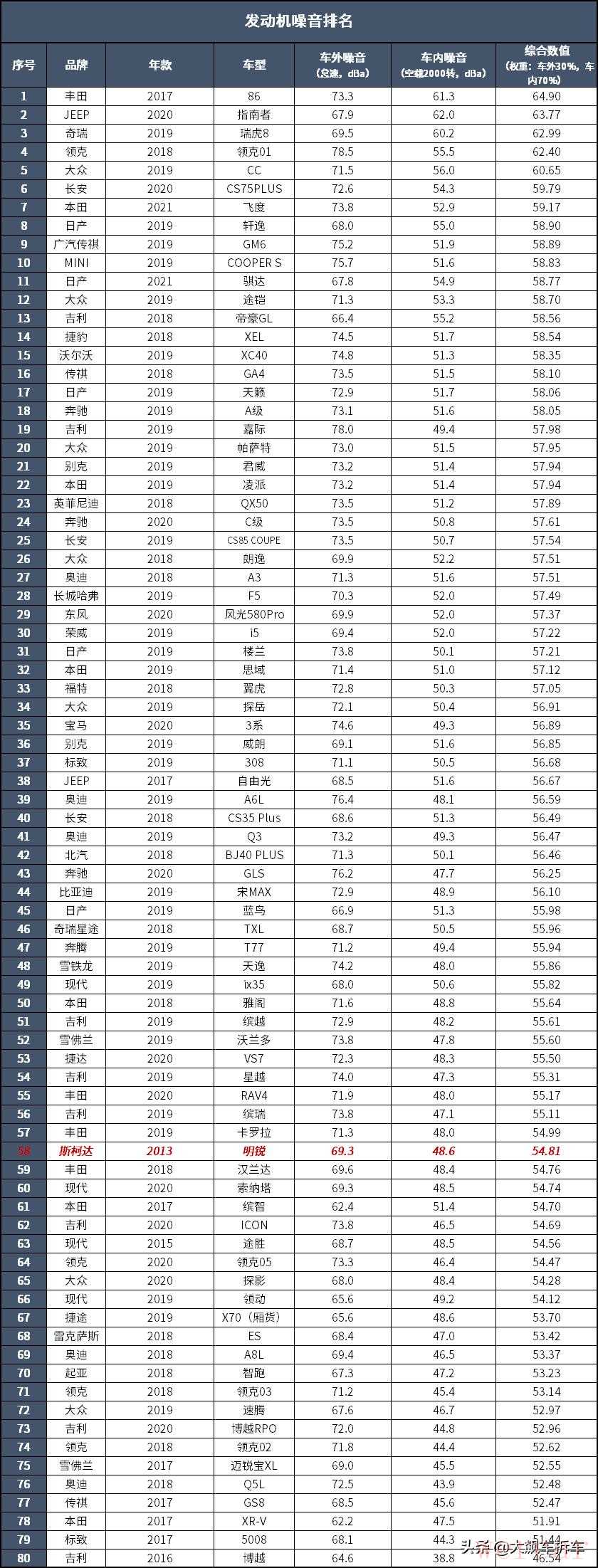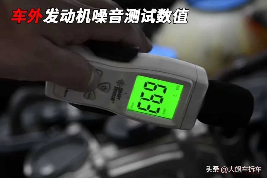 测试方法:发动机完全热机,水温正常,关闭空调,正常怠速下进行测试;打开发动机盖、取下引擎罩,在距离发动机机体上方20厘米处,进行噪音采集,取平均值,为车外发动机噪音数值(dBa);在车内,将车窗关闭,发动机空载运转2000转/分,将噪音仪置于方向盘正上方,取平均值,为车内发动机噪音(dBa)数值。并且以车内30%,车外70%的权重进行综合计算。