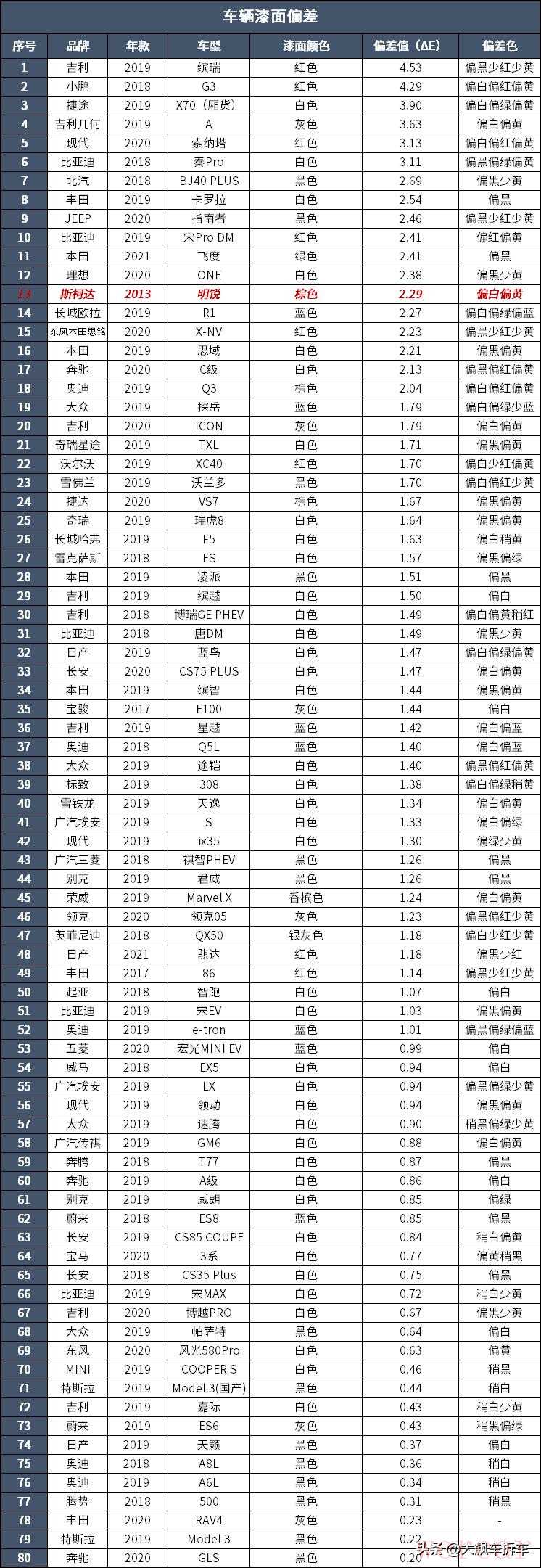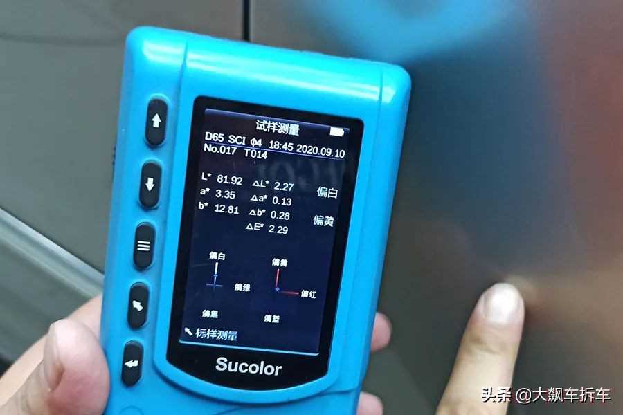 这辆车的引擎盖和右侧前翼子板经过喷漆处理,最大色差值位于右侧前翼子板处,色差值为2.29ΔE,比基准点偏白偏黄。所以,保护原车漆非常有必要,后喷的漆往往色差较大。