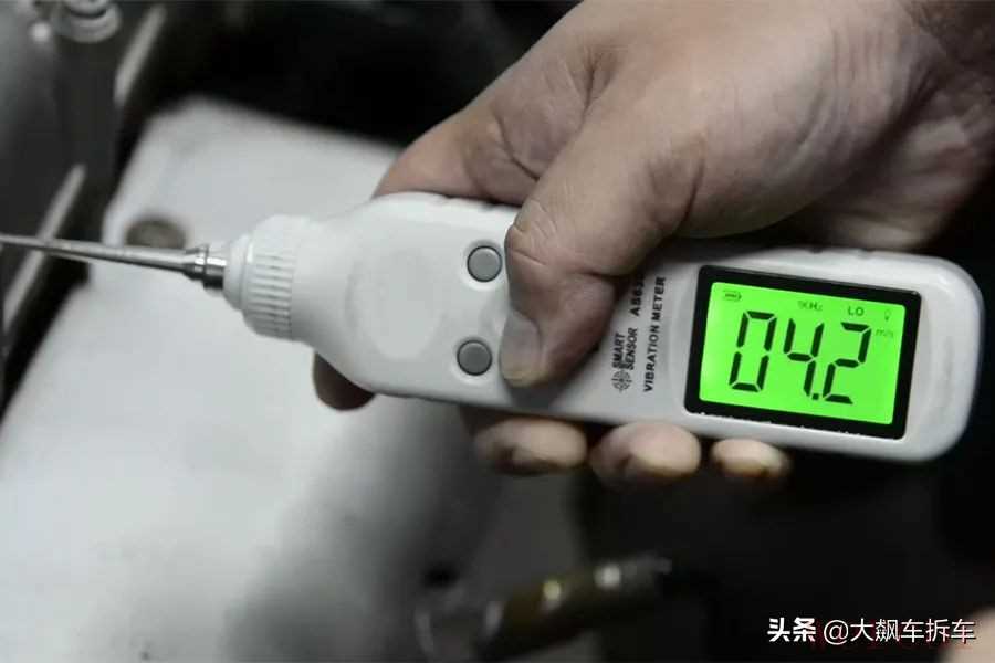 测试方法:水温正常后,关掉空调,在怠速状态下,使用测振仪垂直曲轴方向,将探针接触发动机金属机体中间的最高位置,测量发动机振动加速度值,数值越低,表明振动越小。