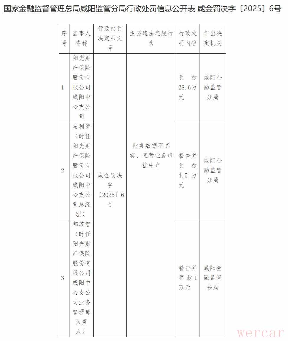 国家金融监督管理总局网站信息显示,国家金融监督管理总局咸阳监管分局7月15日通报,因财务数据不真实、直营业务虚挂中介,阳光财险咸阳中心支公司被罚款28.6万元,时任公司总经理马利涛被警告并罚款4.5万元,时任公司业务管理部负责人都苏智被警告并罚款1万元。