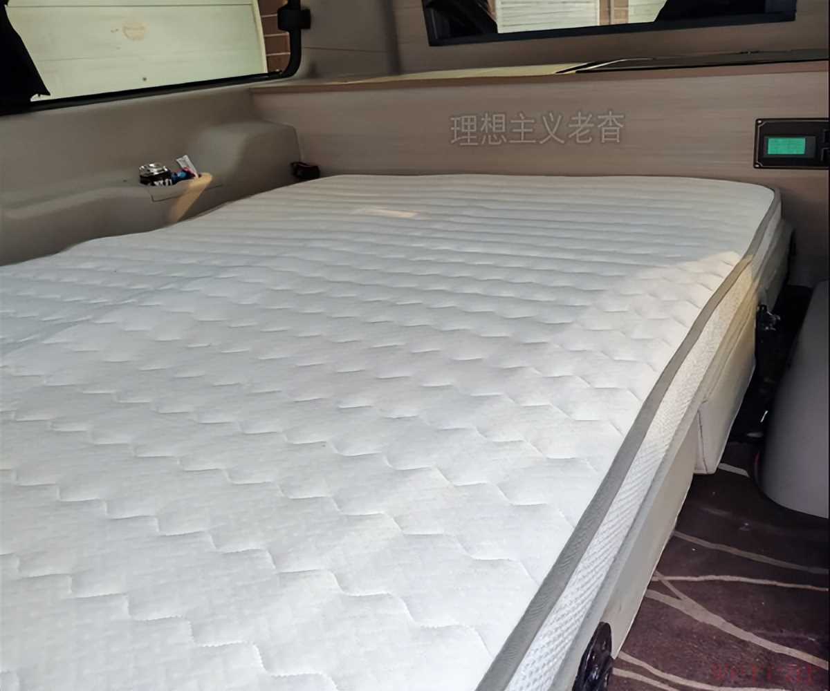 降下升降桌,放平中后排座椅,就可拼成一张竖向双人床,铺上柔软的床垫,再拿出被褥枕头,后面横柜作为床头柜使用,微客厅秒变小卧室,解决了旅途休息问题。