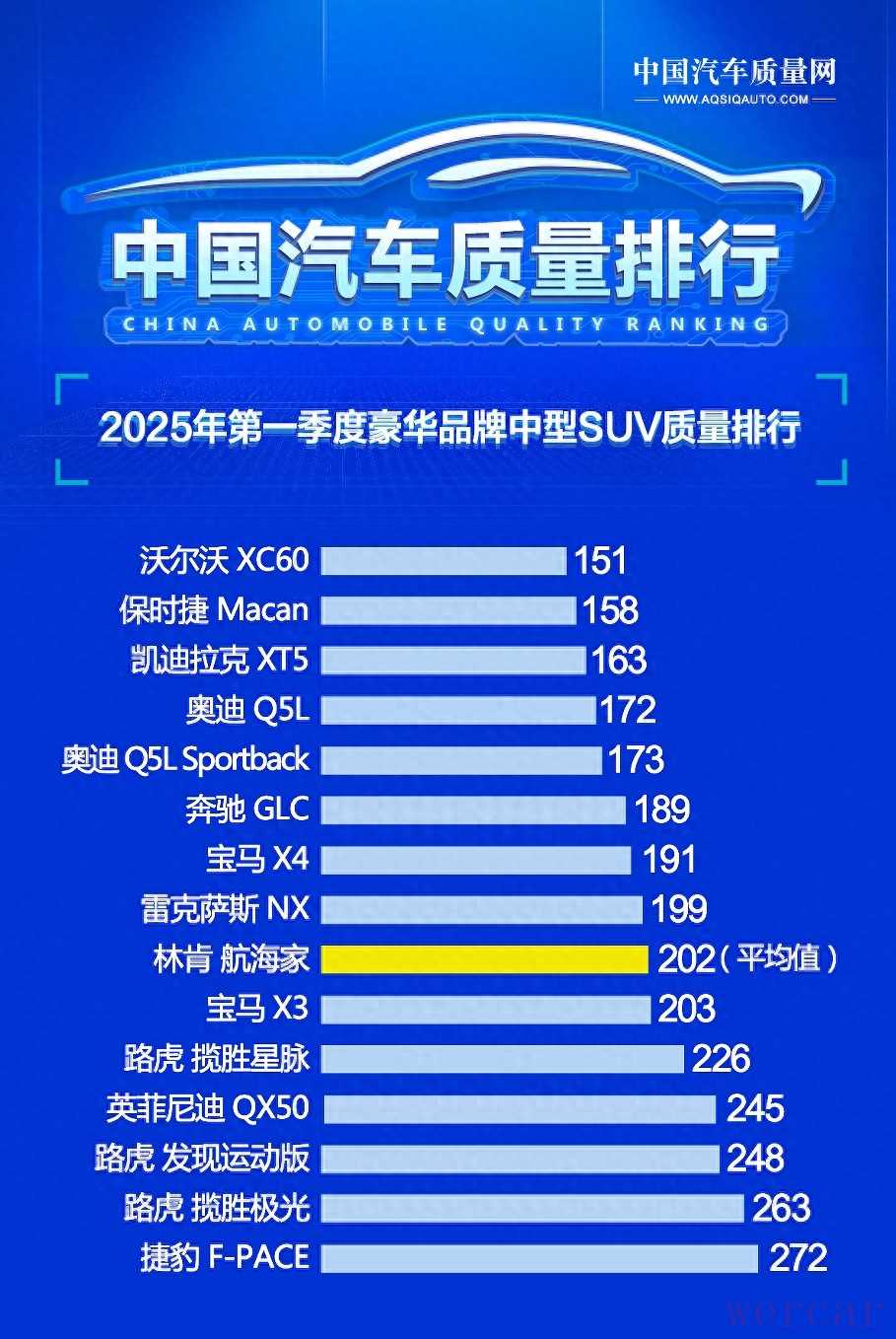 奔驰GLC排名第六位,质量测评分数达到189分,品质表现很“奔驰”。宝马X4排名第七位,质量测评分数到达191分,典型的德系品质。此外,雷克萨斯NX和林肯航海家的质量测评成绩小于或等于平均分,传统豪华大厂的品控实力一直在线。