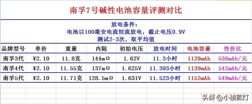 从对比图来看,南孚三代电池的重量差不多,内阻一代比一代低,第5代电池的容量比前两代略有增加,但并不明显,因此升级意义不大。