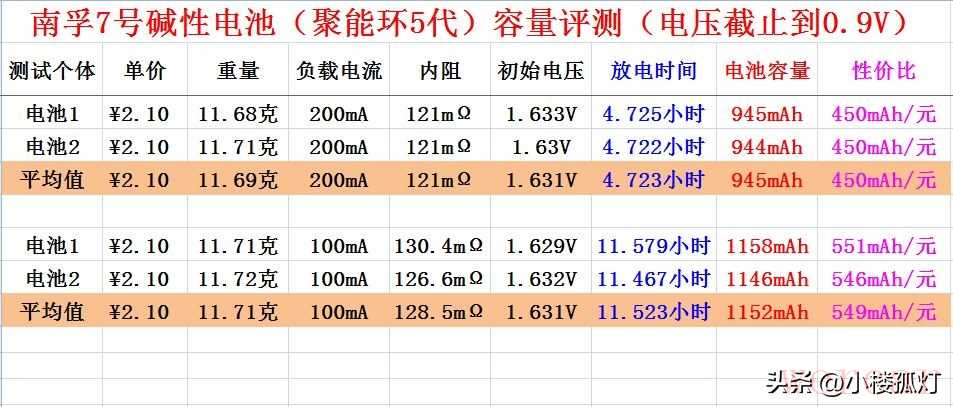 从以上测试结果来看,南孚7号碱性电池(聚能环5代)以200毫安电流恒流放电的容量均值为945mAh,以100毫安电流恒流放电的容量均值为1152mAh,性价比约549mAh/元。此款电池内阻约128mΩ,保质期为10年,电池容量较大,性价比中等。