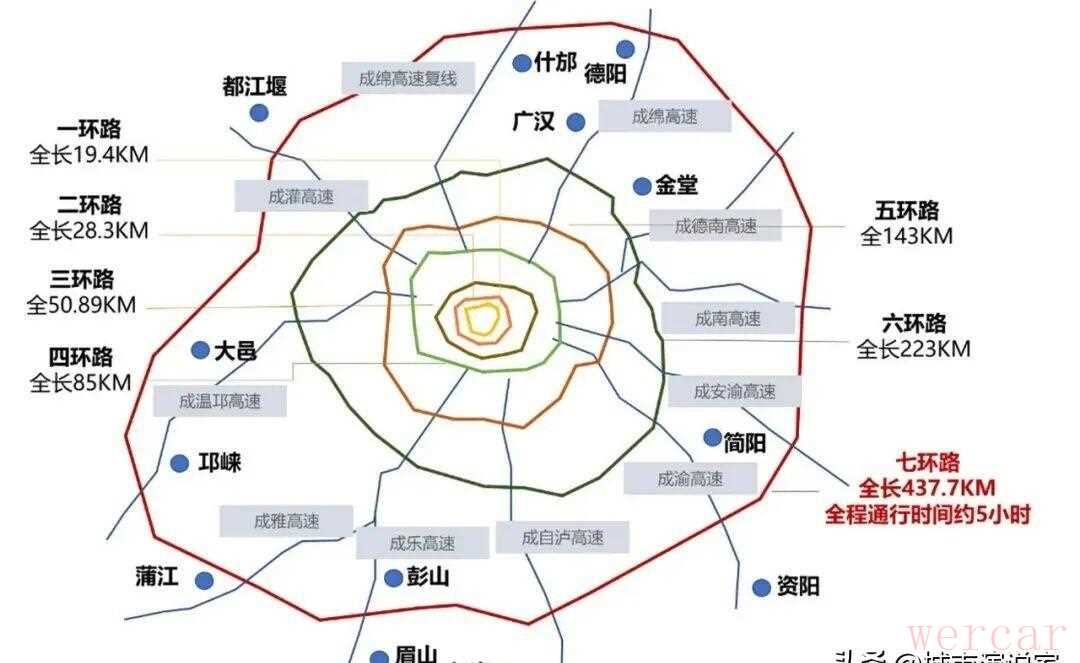 往回看政策和历史,成都前三条绕城路已经运行好多年,形成了不同层次的圈。最早那条约85公里,2001年建成,官方叫四环路;从2019年12月1日起,成都牌照的车只要合法装ETC,就能免费走这条四环。第二条圈更大,全长223公里,2015年建成,被称为六环路。第三条更长,437公里,2021年通车,官方名字是成都经济区环线,民间多称为七环。越往外,圈越大,覆盖城市多,很多不是成都行政范围内的。