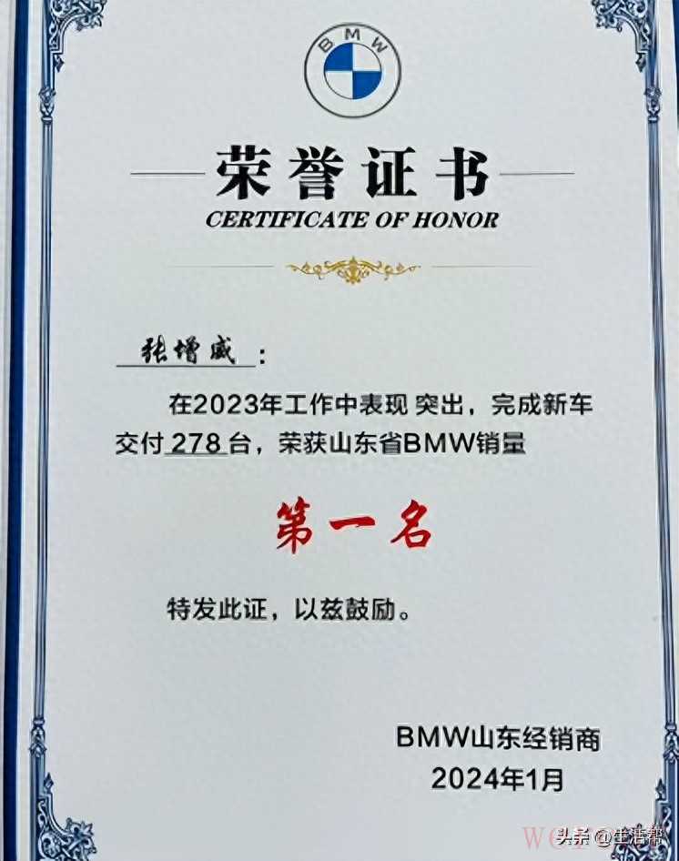 一年卖出278台宝马车,拿下山东省BMW销量第一名,单月交车最高记录43台,订单记录46单,最高年收入80多万元……这曾是张增威个人的辉煌战绩。