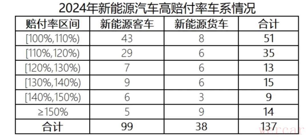 多个车系承保赔付率超过100%,中国精算师协会对此作了详细披露:保险业共承保车系(一个汽车品牌旗下的一类车型集合)2795个,其中赔付率超过100%(尚未考虑财险公司日常经营管理费用成本)的高赔付车系有137个。从客车看,承保车系1654个,承保车辆2982万辆;承保车辆数超过1万辆的车系301个,其中赔付率超过100%的车系有99个。从货车看,承保车系1141个,承保123万辆;承保车辆数超过0.5万辆的车系55个,其中赔付率超过100%的车系有38个。