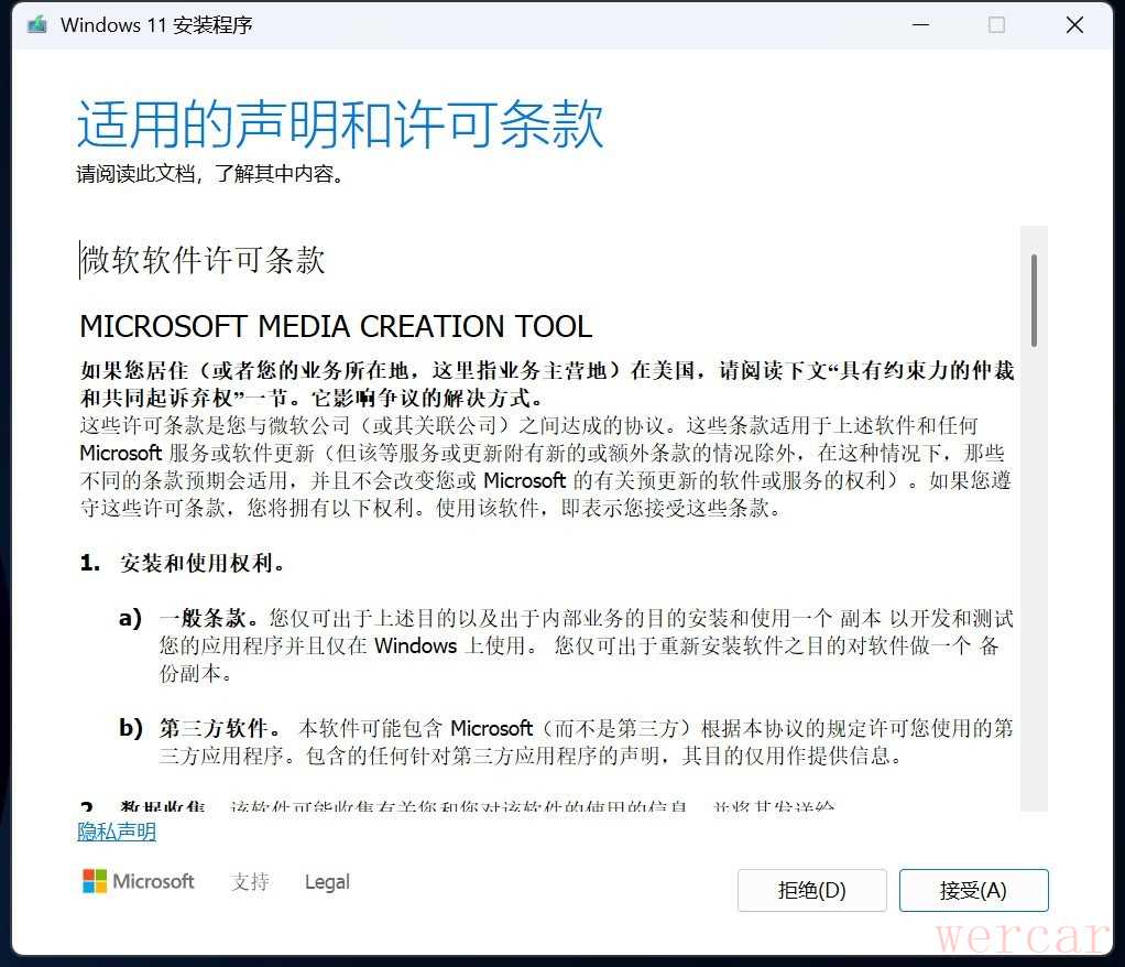 然后要准备一个8GB以上容量的U盘,不推荐使用存储卡+读卡器,也不推荐移动硬盘,以免安装系统时候不被BIOS识别。由于制作启动盘的时候会清空里面的数据,记得提前备份。接下来运行下载的Media Creation Tool,同意声明和许可条款,这里面的内容不用纠结,毕竟拒绝的话就无法使用了。