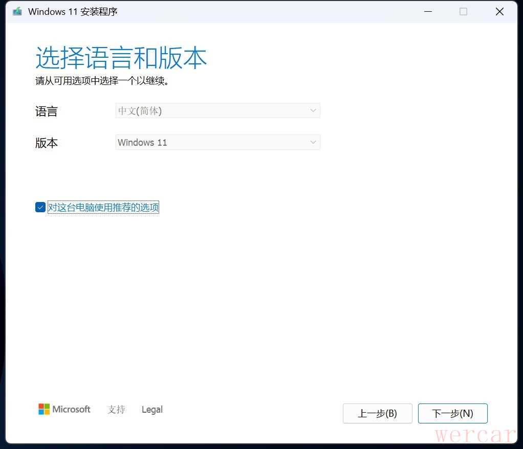 然后选择默认的语言(简体中文)和Windows系统(Windows11),勾选“对这台电脑使用推荐的选项” ,再点下一步。