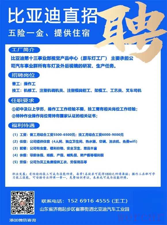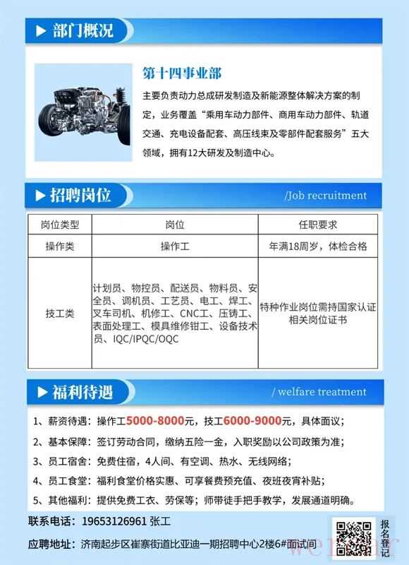 关于济南比亚迪比亚迪股份有限公司成立于1994年,业务横跨汽车、轨道交通、新能源和电子四大产业,是香港和深圳两地上市的世界500强企业。济南比亚迪汽车有限公司是比亚迪全资子公司,主营业务是新能源汽车生产制造,目前主要生产的车型有海豹06、腾势 N7、腾势N9、宋L、元 PLUS等新能源汽车及电机、电动总成、车灯、制动器等新能源汽车核心零部件制造,是比亚迪集团新能源整车制造的核心基地之一,未来将建设成为山东省内最大的新能源乘用车制造基地。公司始终贯彻“以人为本”的用人理念,通过技术创新,实现团队共赢。来源:济南人社