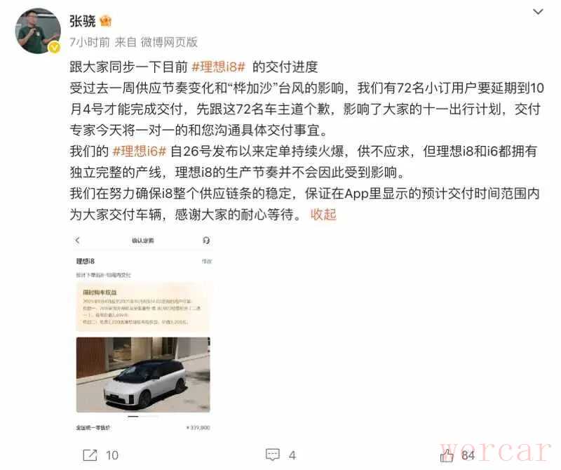 9月28日,理想汽车产品线负责人张骁向用户同步目前理想i8的交付进度。张骁表示,受过去一周供应节奏变化和“桦加沙”台风的影响,我们有72名小订用户要延期到10月4号才能完成交付,先跟这72名车主道个歉,影响了大家的十一出行计划,交付专家今天将一对一的和您沟通具体交付事宜。自26号发布以来定单持续火爆,供不应求,但理想i8和i6都拥有独立完整的产线,理想i8的生产节奏并不会因此受到影响。理想汽车在努力确保i8整个供应链条的稳定,保证在App里显示的预计交付时间范围内为大家交付车辆。汽车事件四:华为车BU CEO靳玉志:L3级自动驾驶将在2027年规模放量
