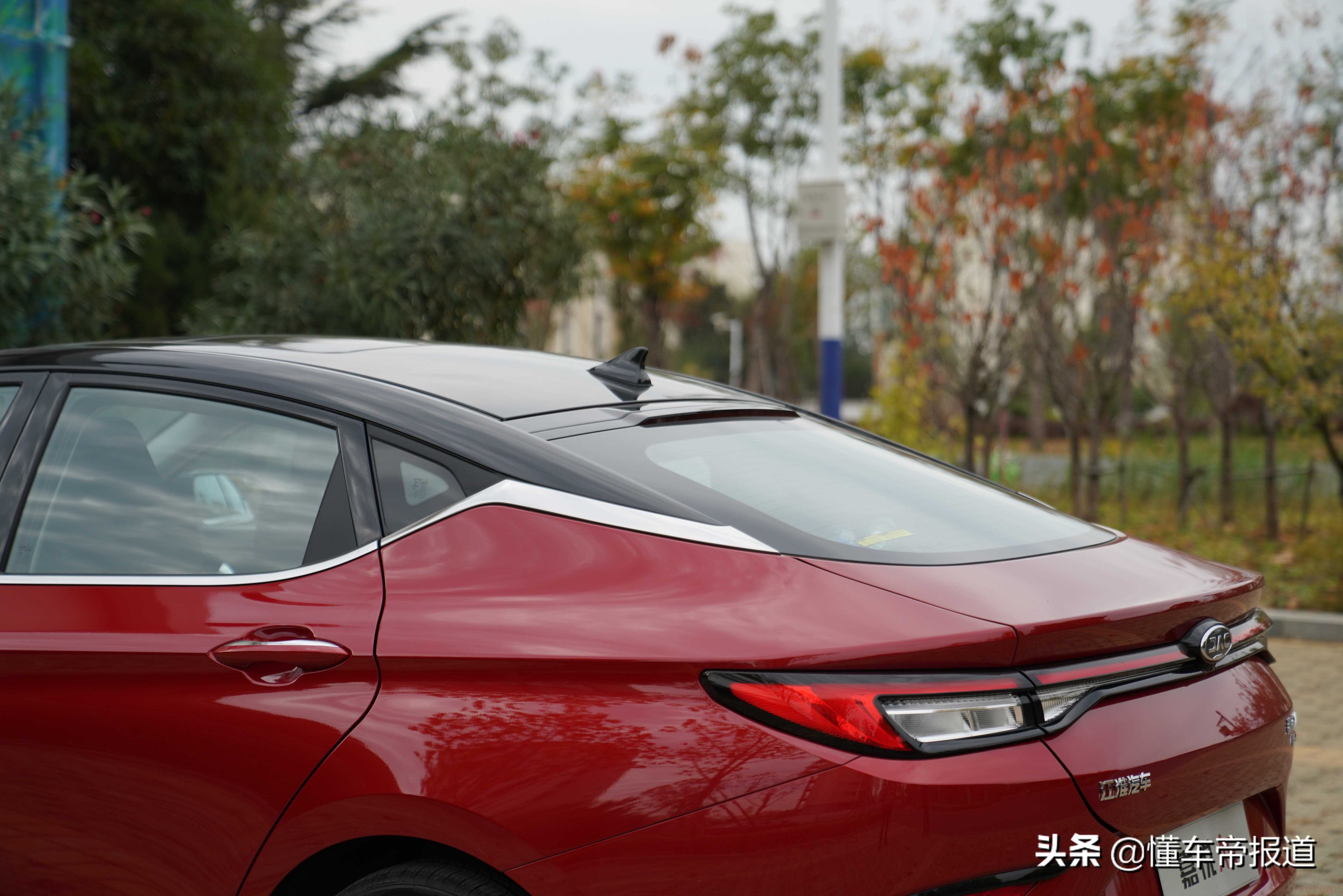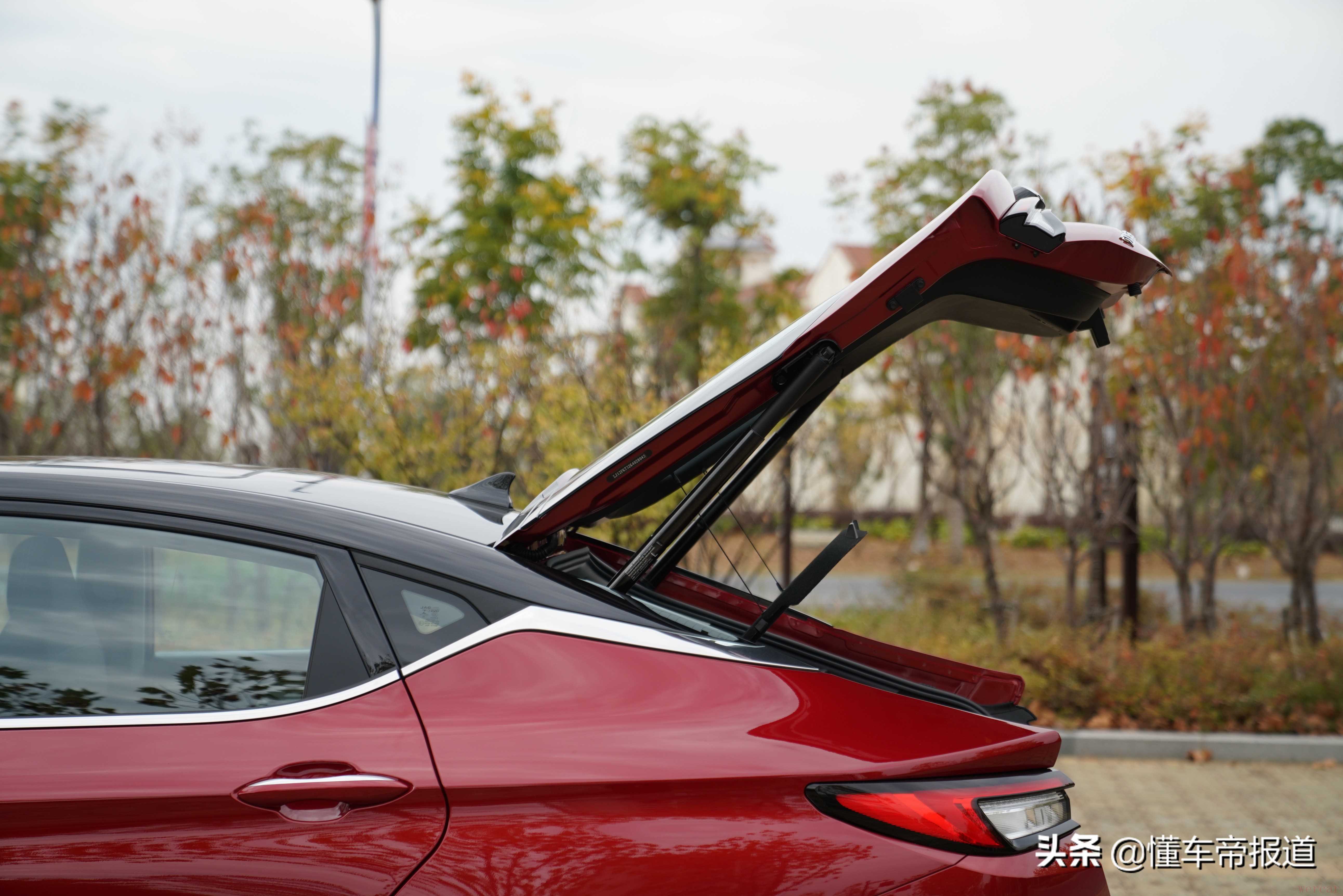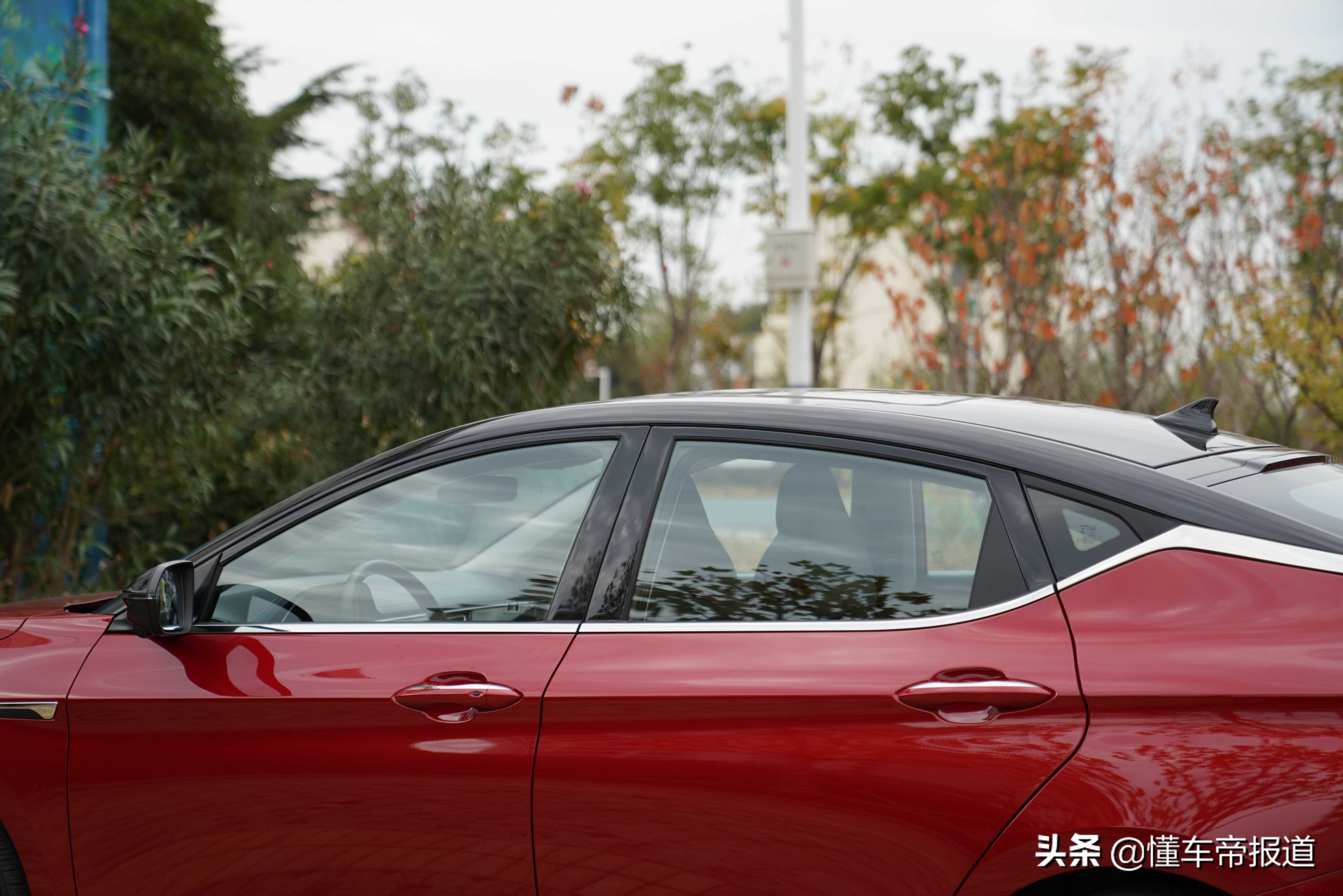 车身侧面,源自轿跑的掀背造型带来了0.29的风阻系数(Cd),同时使新车呈现出优雅动感的车身姿态。单独采用熏黑设计的车顶与下方的镀铬鲨鱼鳍窗线一道,进一步强调了这种轿跑特征。尺寸方面,新车的长宽高分别为4772/1820/1492毫米,轴距为2760毫米,在紧凑型轿车里很有优势。
