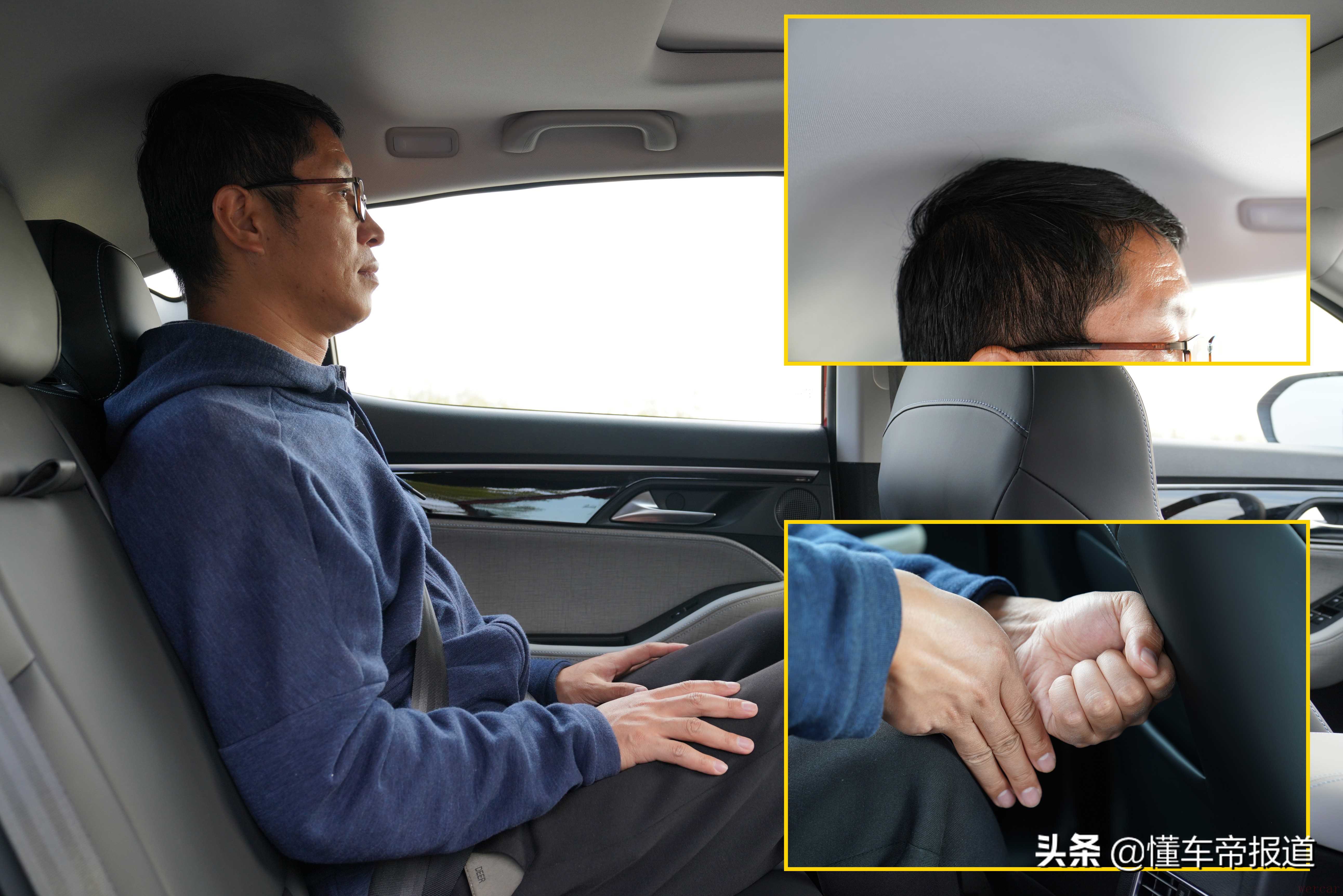 乘坐空间上,身高1.83米的体验者来到前排,将座椅调至正常驾驶坐姿,头部空间还有三指。