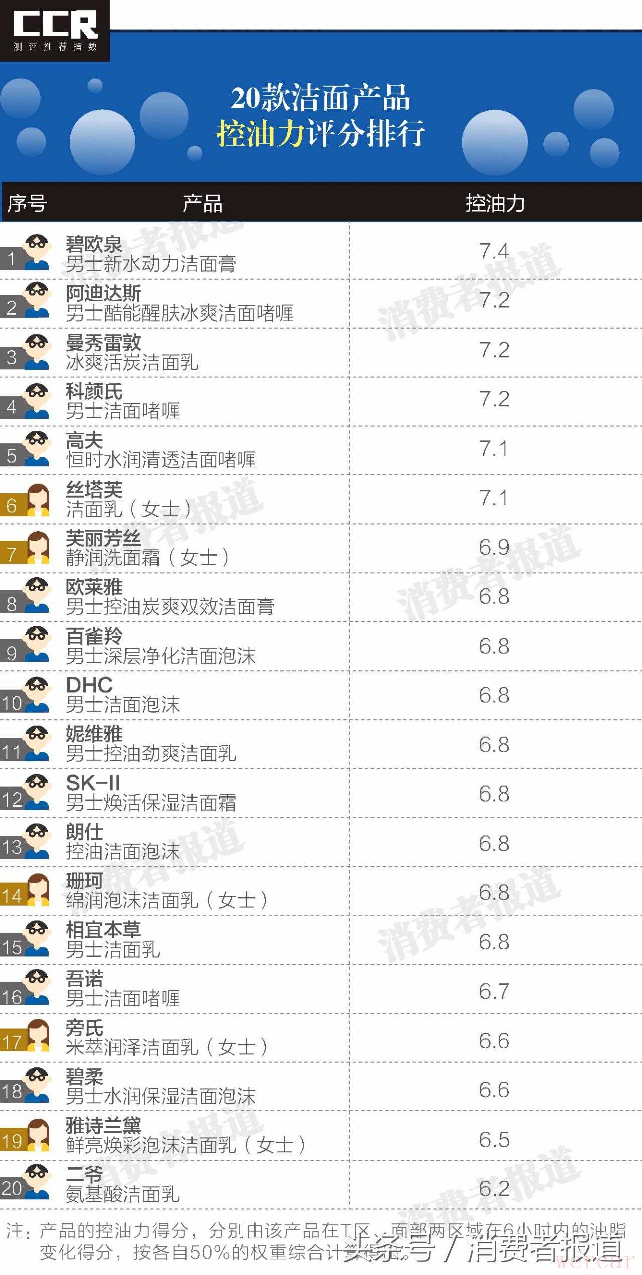 为了测试洁面产品的控油力,本刊了3位志愿者,每人试用完全部20款洁面产品,并监测其洁面前、洁面后半小时、洁面后3小时、洁面后6小时,T区和脸颊两个部位油脂的含量变化,从而评价其控油力。