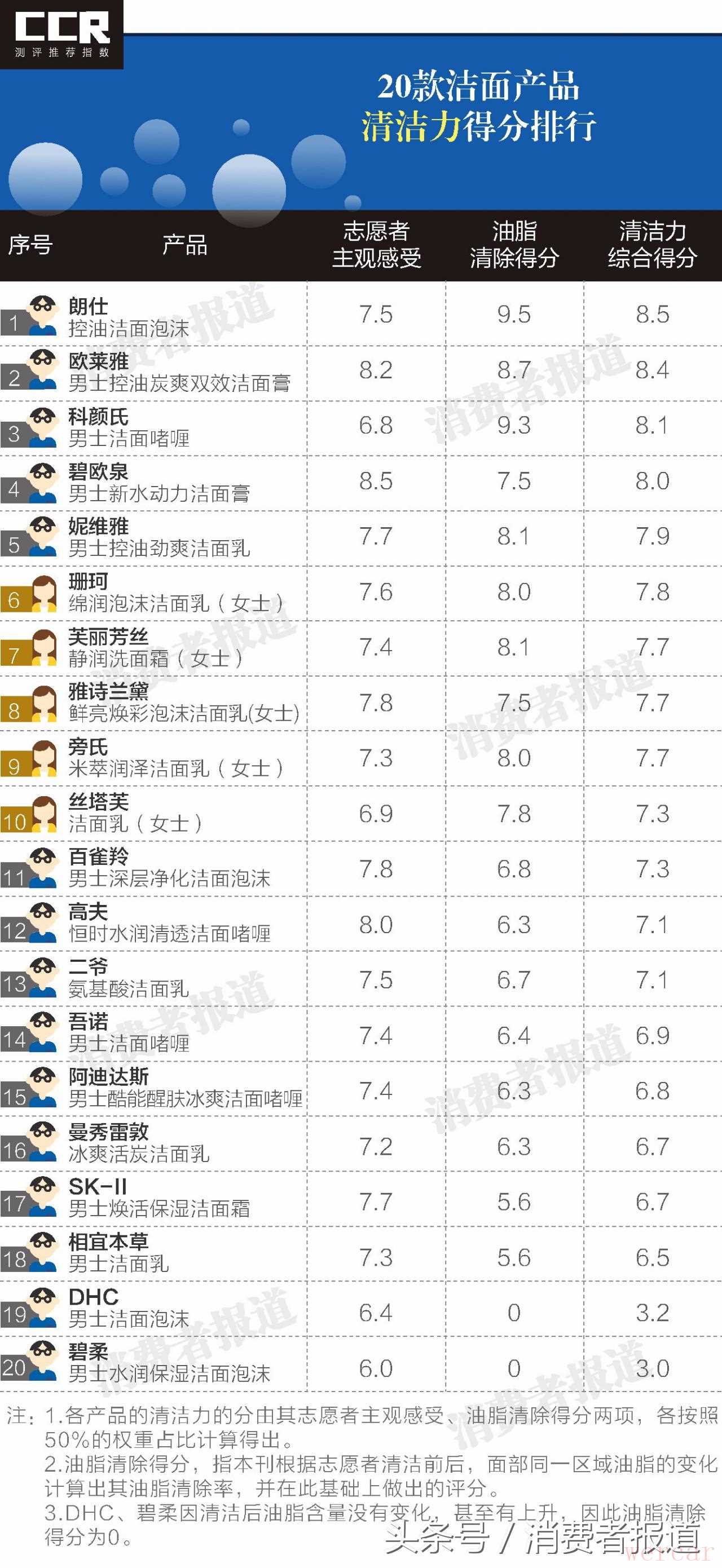 2. 清洁力方面,朗仕、欧莱雅、科颜氏表现佳,DHC、碧柔垫底。