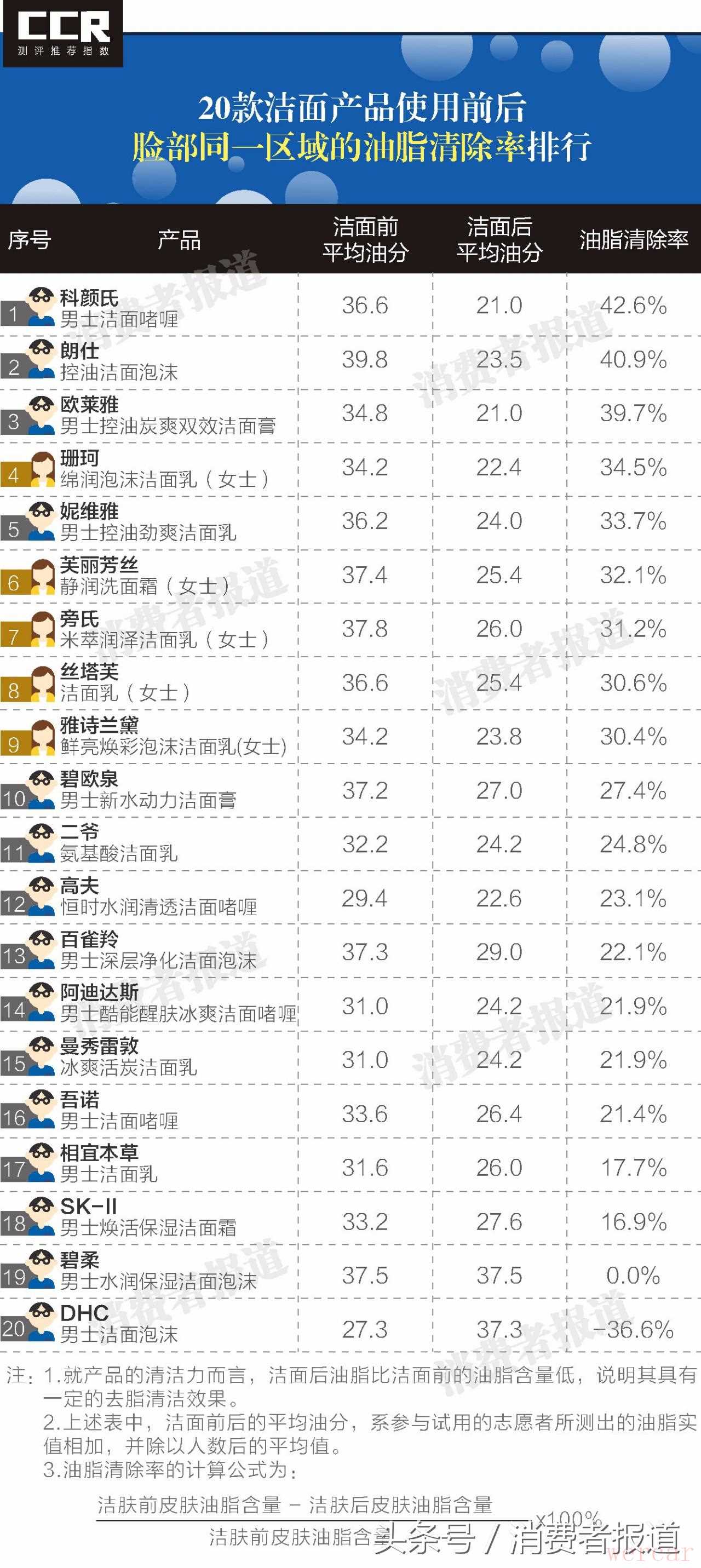 结果显示,朗仕、科颜氏、欧莱雅、珊珂等产品的油脂清除率表现不错,在使用后,能有效降低了皮肤油脂含量,具备较强的去脂清洁效果。