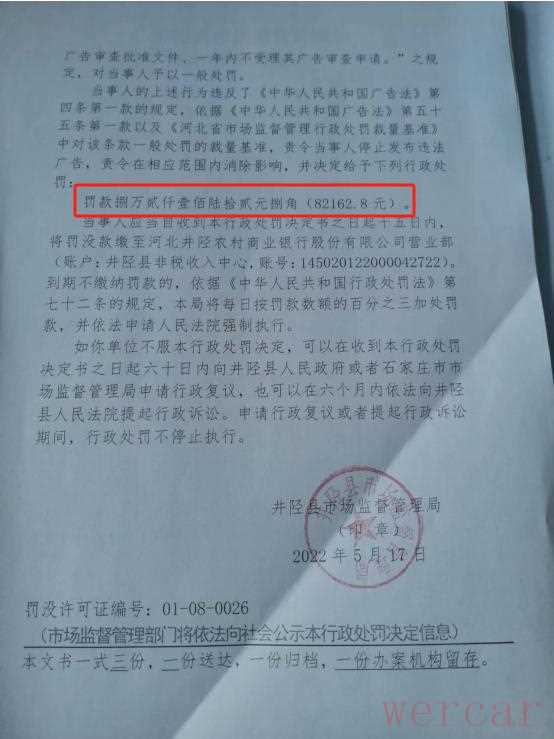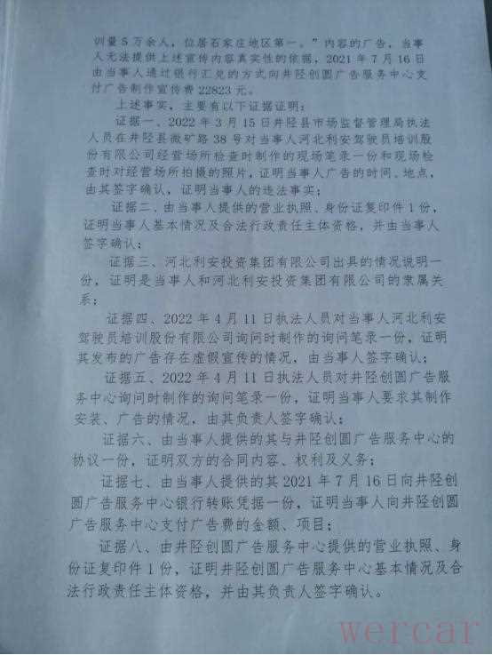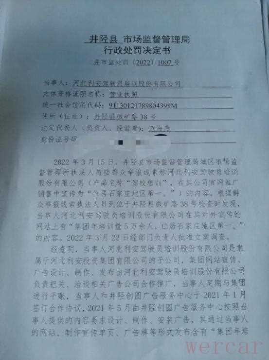 2022年5月17日,因发布虚假广告,河北利安驾校被井陉县市场监督管理局处以8.2万余元的行政处罚。