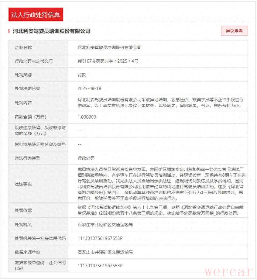 信用河北官方网站,8月18日,河北利安驾驶员培训股份有限公司(简称“河北利安驾校”)因异地培训、恶意压价、欺骗学员等不正当手段进行培训,被石家庄市井陉矿区交通运输局罚款1万元。