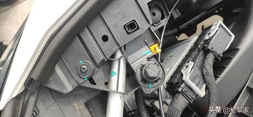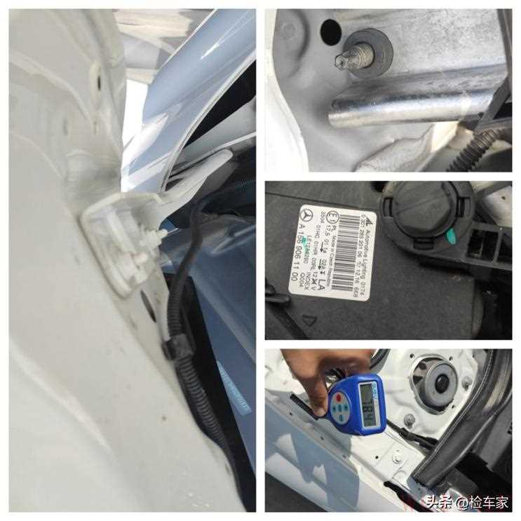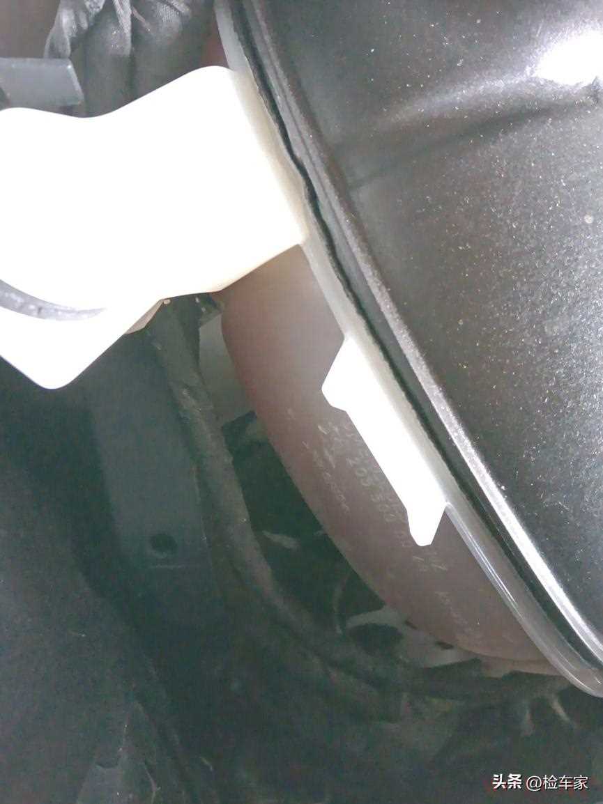 再看发动机机盖链接螺丝也没有问题,水箱框架主螺丝没有拧动痕迹;大灯日期标签符合出厂时间,螺丝未发现拆卸痕迹;减震器座数值正常。我们一般可以通过机盖螺丝是否有松动、喷漆和位移来判断前脸的整体状态,此车机盖没有发现上述问题,进一步证明此车前部没有发生什么大事故。