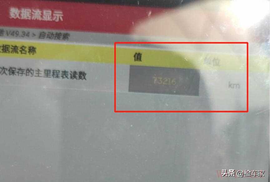 为了验证我的想法,我进一步读取这车的上次保养的主里程,结果很惊喜。上次主里程为73216公里(手机有点差,拍照不够清晰,大家见谅),按照车辆的保养周期推测这车目前应该在8万公里左右,而车辆目前表显公里仅为4万多公里,所以这车调表了。