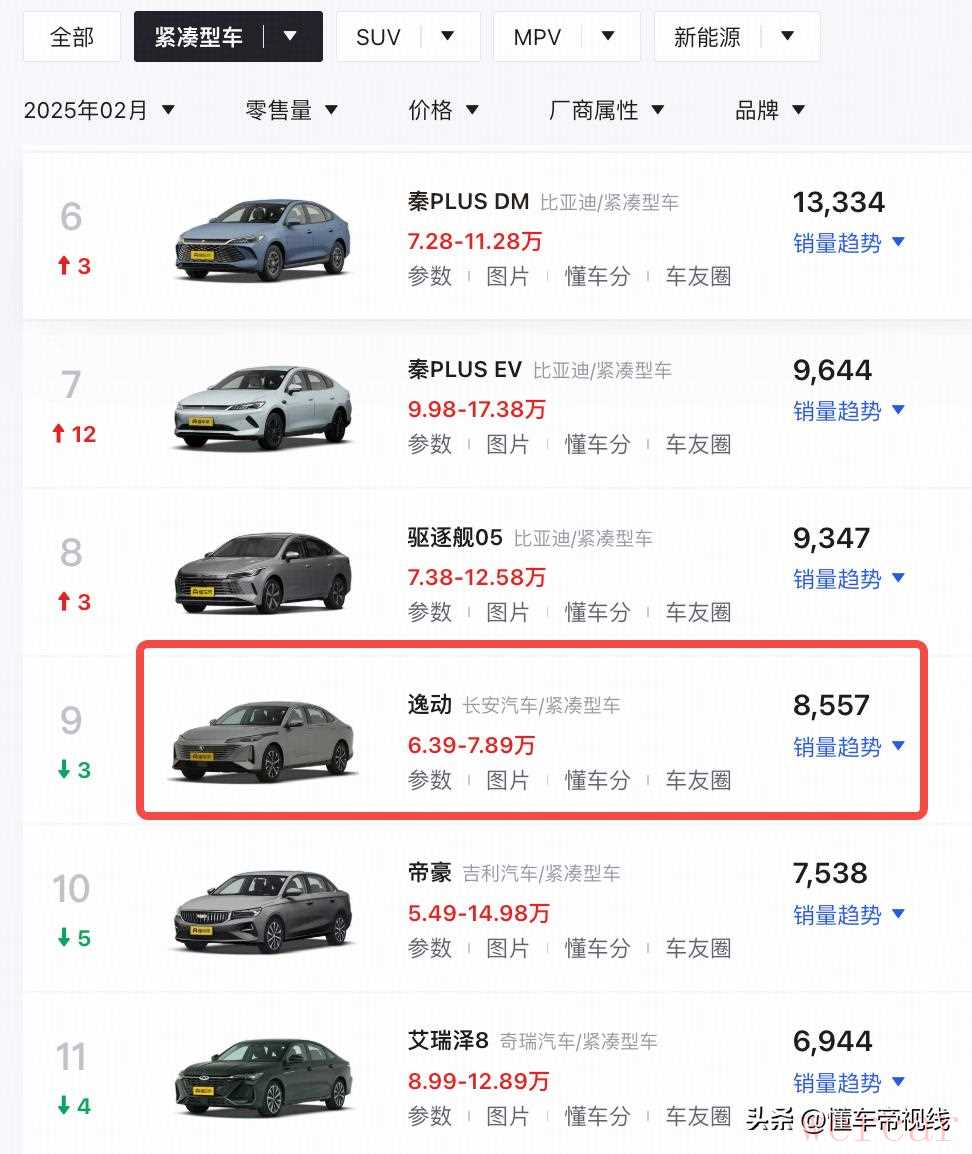 根据车型级别来看,与第三代逸动处于同级的车型包括吉利帝豪(指导价6.29万-14.98万元)、奇瑞艾瑞泽5 PLUS(指导价格区间为7.49万-11.99万元)、吉利缤瑞(指导价格区间为8.98万-10.98万元)、大众宝来(指导价11.29万-14.39万元)等。结合销量数据显示,2025年2月,长安逸动销量为8557辆,销量在该级别排名第9位。对比相似价位车型,您觉得2025款长安逸动竞争力如何呢,欢迎评论区留言。
