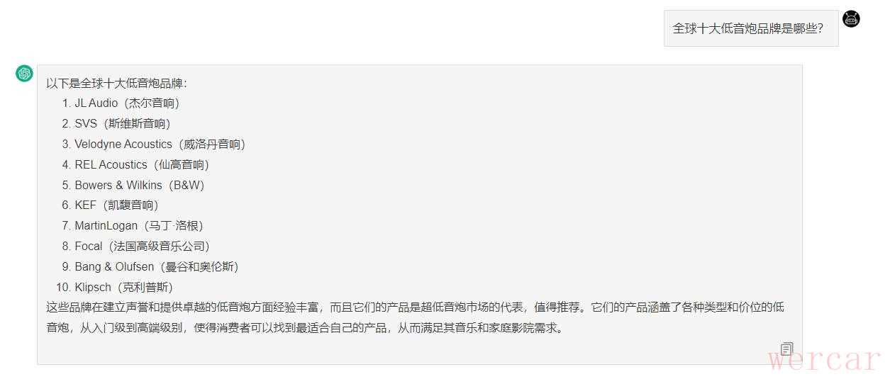 当我写到这里的时候,我尝试把这个问题甩给了ChatGPT。作为目前最强大的智能系统,我也想试试看它的本事。结果还不错,它给的结果还算中肯和靠谱,就是这翻译的厂家名字……基本没一个靠谱的……但还是顺着往下说吧,接下来笔者就通过自己的了解,去掉一些不行的,再加进去一些自认为行的,然后把我所知道的十大低音炮罗列给大家。