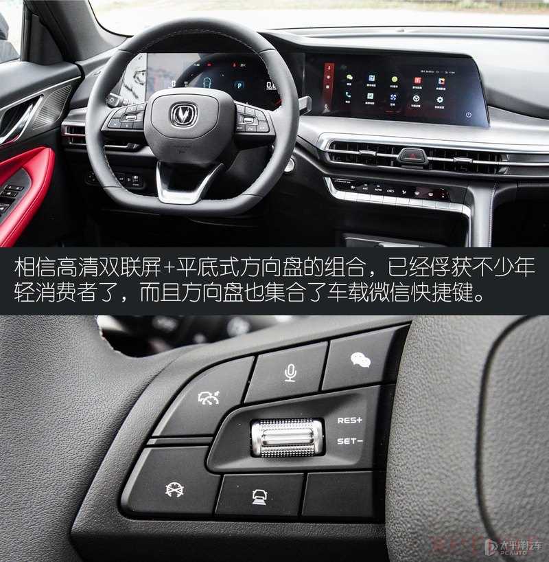 此前的CS35PLUS内饰和外观一样都偏向中规中矩,但这有个问题,就是CS35PLUS这样一款在定位吸引年轻人的畅销车型,确实有点平庸了,而如今新款的内饰可以说很好的弥补了这点。更时尚的内饰配色,10.25英寸大屏+7英寸液晶仪表,更简洁的中控台和出风口,车载微信等都是年轻化的特征。并且质感得到了大幅提高,平底式方向盘造型甚至可以看齐UNI-T,这也必然能让年轻消费者更感兴趣。