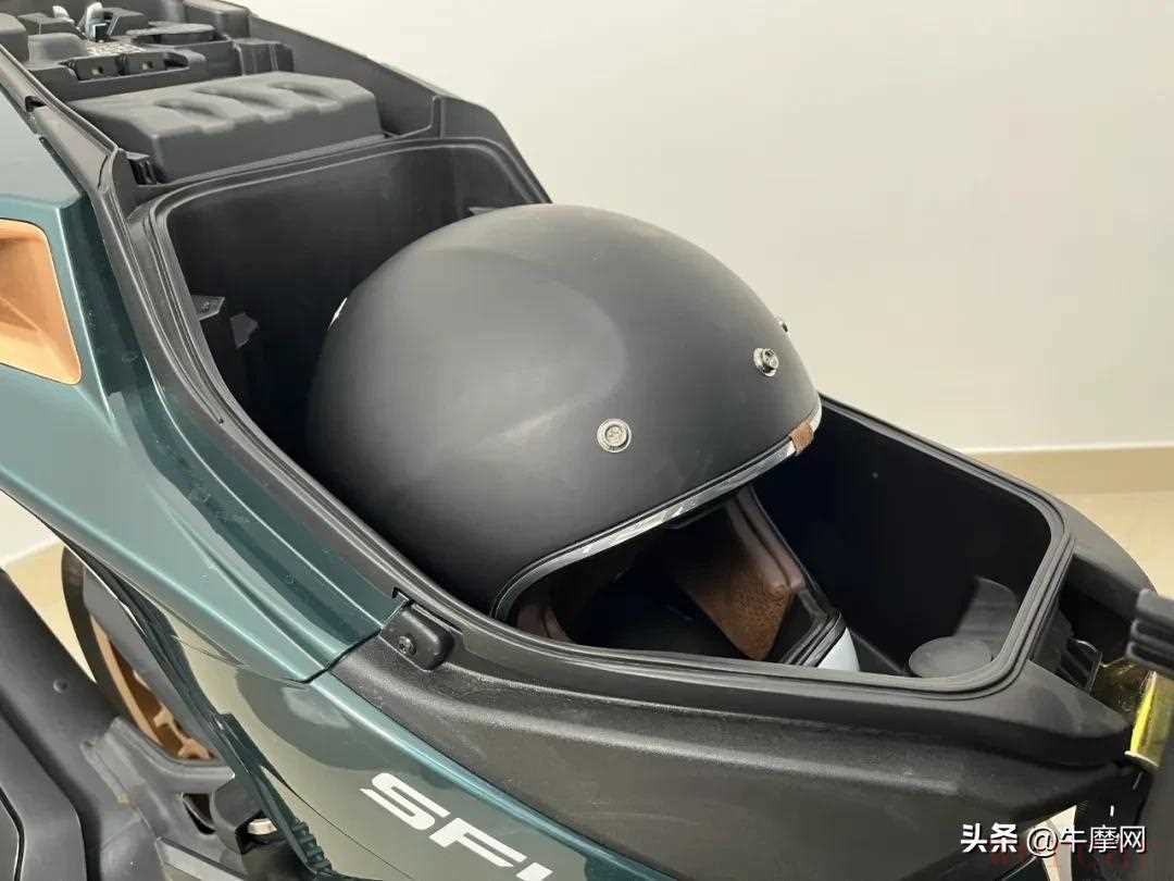 此外,它的坐垫下的置物空间也非常大,可以放下一顶3/4盔,并且放下之后空间还有富余,可以容纳手套、雨衣等物品。对于许多头盔都无法放下的运动踏板来说,SF4+的这个置物空间是一个非常大的优势。因为它不用加装尾箱等即可放下头盔、雨衣等物品,而加装尾箱除了外型受影响外,车辆的操控性也会大打折扣,对于小排量踏板来说,牺牲有点大。