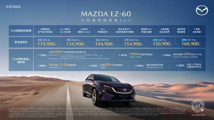 作为长安马自达首款全球战略级新能源SUV,EZ-60在造型设计、操控性能、智能座舱、主被动安全、匠心品质五大核心价值领域全面遵循全球标准,致力于为中国以及全球市场用户打造卓越的出行体验。