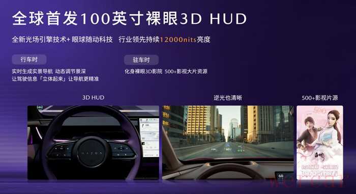 EZ-60全球首发100英寸裸眼3D HUD,将车载HUD视觉技术推向全新高度。SLHM空间算法+导航让信息呈现出“分层景深”,最大限度消除视觉延迟,避免潜在的分心事故。眼位追踪功能让画面和眼球随动,解决了HUD“飘、抖、晃”的技术痛点。此外,3D-HUD还能化身裸眼3D影院,线上影视库提供超过500部3D片源,在停车休息或和家人露营时,超爽大片可以一次看个够。