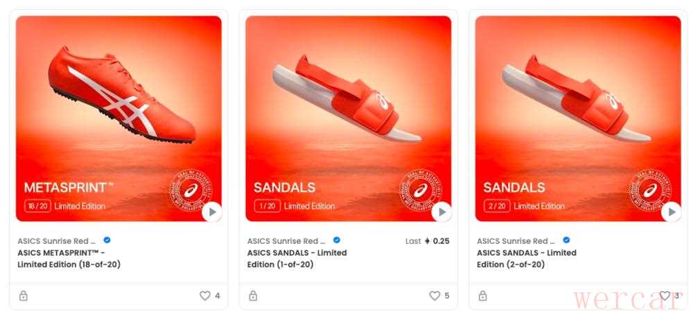 老大耐克重金投入、老二阿迪交友广泛,连“不三也不四”的亚瑟士都占着第一家发布NFT球鞋公司的名号。2021年7月中旬,亚瑟士在OpenSea上线9款NFT球鞋。