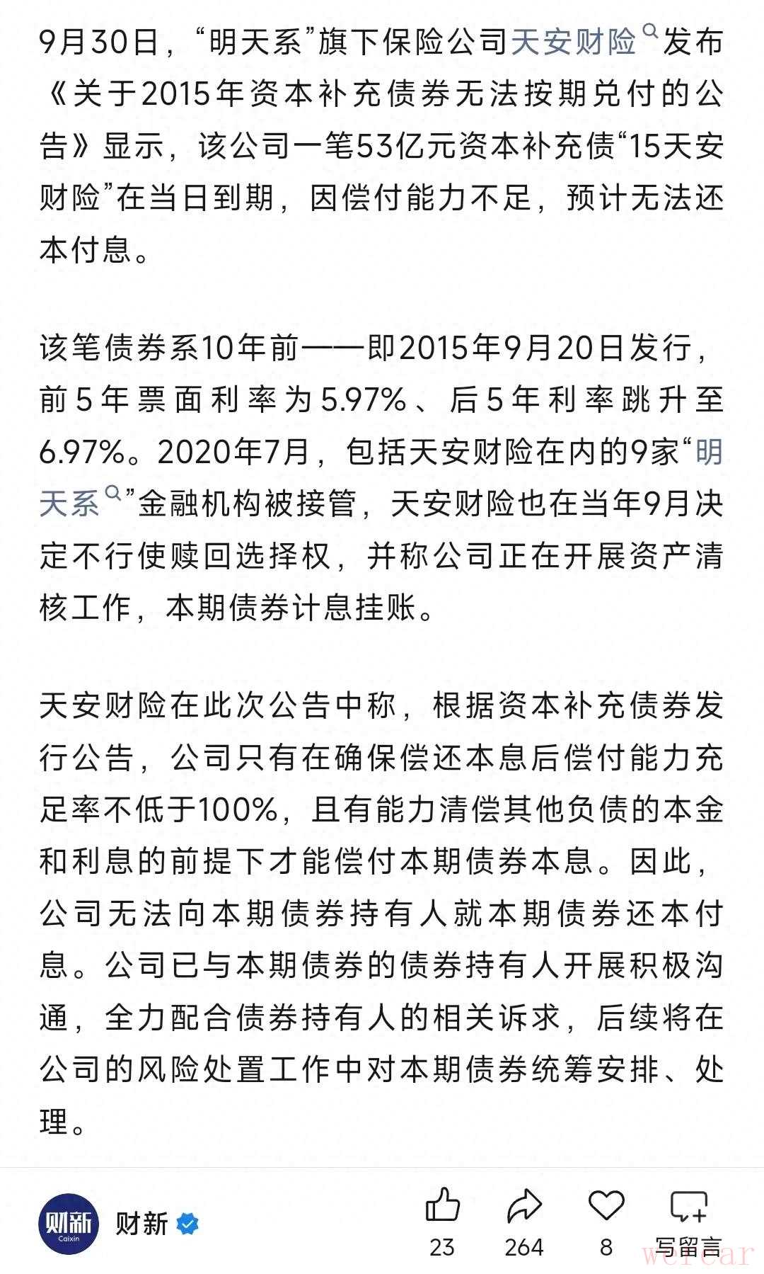 天安财险在公告中解释,不能确保在偿付本期债券本息后的偿付能力充足率不低于100%且有能力清偿其他负债,因此无法向债券持有人还本付息。
