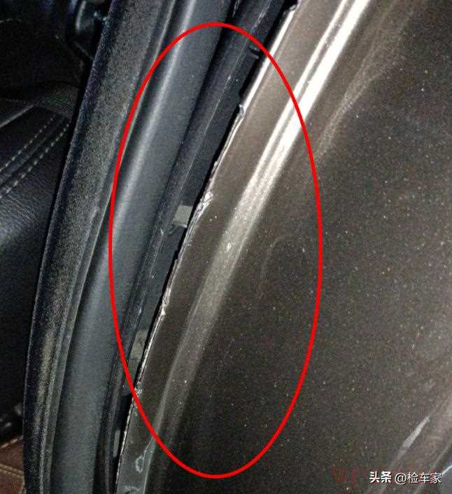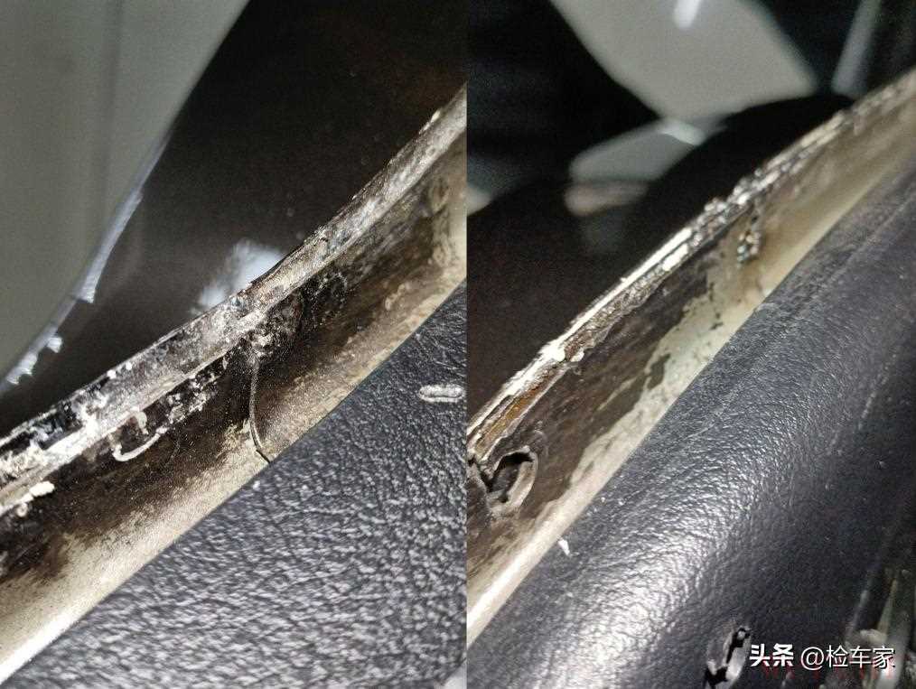 扒开胶条之后,可以看到C柱内侧上半部分的焊点全都没有了,肯定是切割修复过的。咱们来找找切割口。
