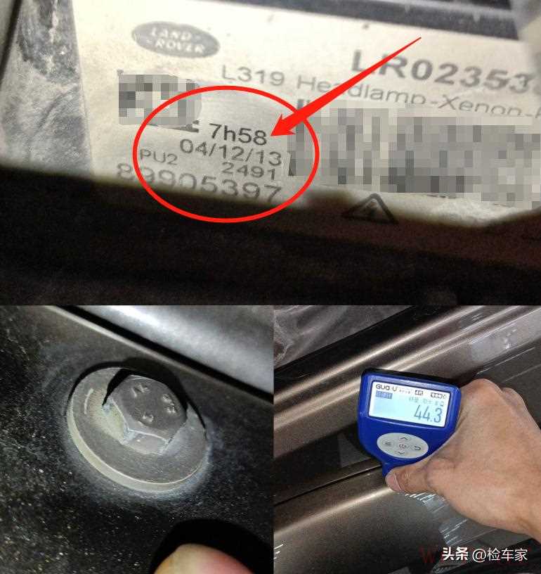 左前大灯生产日期为2013年12月,而这辆车出厂日期为2012年,那么大灯无疑也是更换了,再看旁边的翼子固定螺丝有拆卸痕迹,漆膜仪测出数值起仅为44.3微米,比原厂数值低太多了,看来翼子板也更换了副厂的。