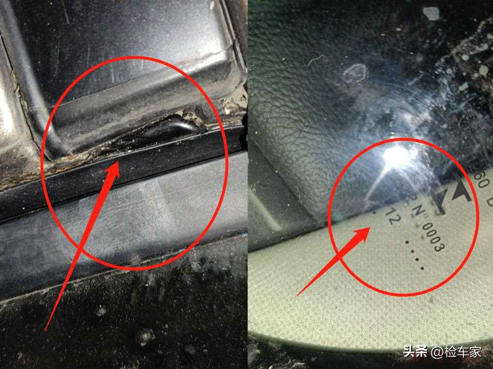 接着来到前挡风玻璃,玻璃日期虽然符合生产日期,但仔细看挡风玻璃与A柱连接处有明显溢出的玻璃胶,说明这张挡风玻璃有过拆卸。拆卸过前挡玻璃却又没有更换,这不得不让我提高警惕了,怕不是为了维修切割更换A柱或者车顶?切割了的话那就是重大事故车了。
