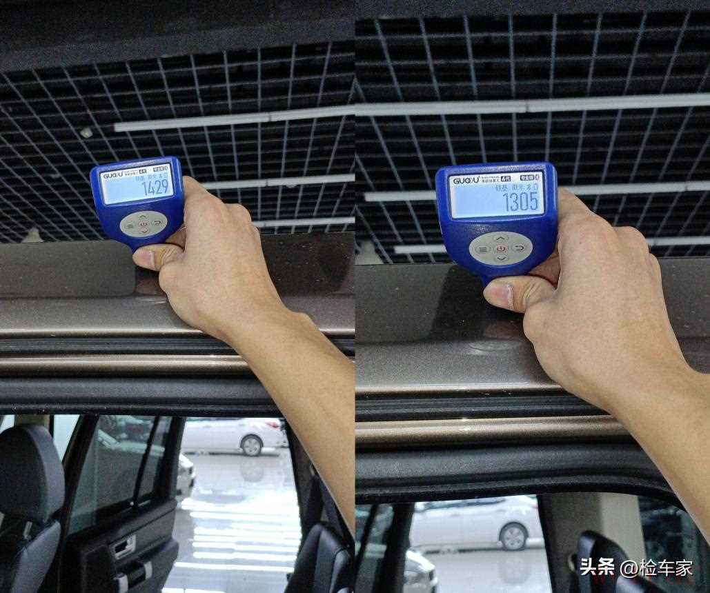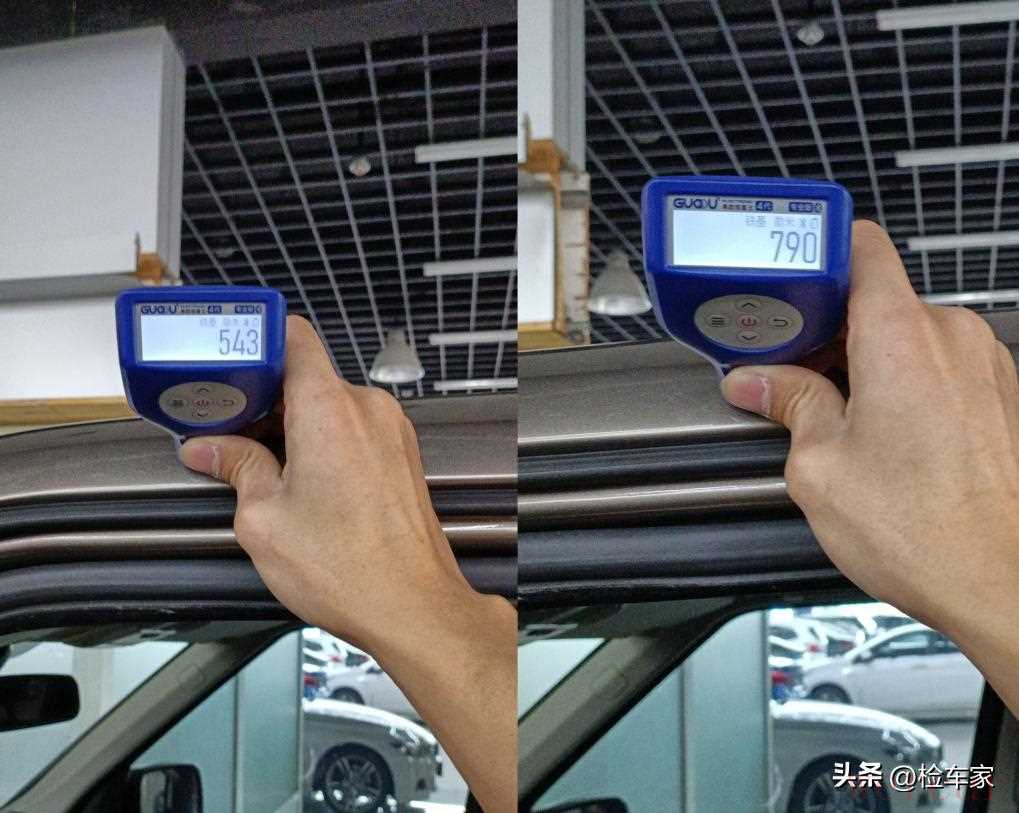 不出所料,A柱外侧存在腻子修复,厚度已经超过了400微米,修复长度也超过了8厘米,按照国标定义,这已经在事故车的行列了。