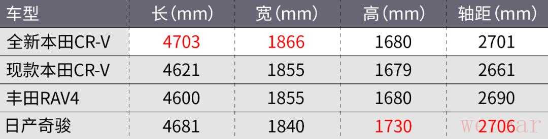 尺寸方面,全新CR-V相比现款车型车长增加了82mm,宽度增加11mm,轴距增加40mm,明显大了一圈。同时,车辆的车长和宽度也达到了同级别的领先水平。不过在高度和轴距方面,全新CR-V还是比日产奇骏稍小一点。