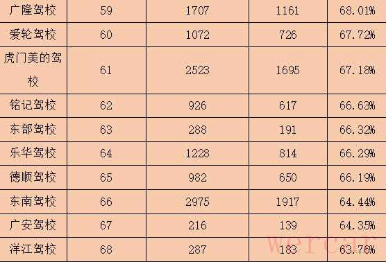 乐华驾校、德顺驾校、东南驾校、广安驾校、洋江驾校6月考试合格率在全市排名后五位。全部68家驾校学员考试平均合格率为74.30%。