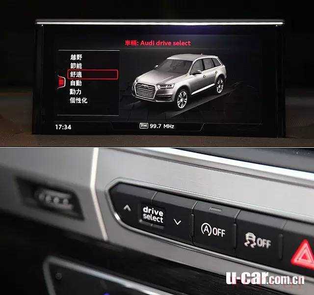 Q7驾驶模式包括Effieciency节能、Comfort舒适、Auto自动、Dynamic动力和Inpidual个性化。上图中的Offraod模式当时试驾车款并没有支援。下图为奥迪 Drive select可程式车身动态系统按键,位于中控台左方靠近驾驶者的位置。